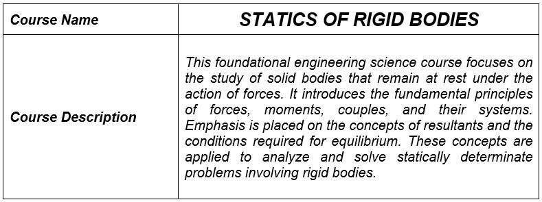 Course Outline 1 Fundamental Concepts 1.1 Force and their characteristics Lecture videos and notes will be uploaded soon 🙂 1.2 External and internal effects of forces Lecture videos and notes will be uploaded soon 🙂 1.3 Force systems; concurrent, non-concurrent, parallel, non-concurrent, non-parallel; coplanar and spatial force systems Lecture videos and notes will be uploaded soon 🙂 1.4 Components of a force; resolution of forces into planar and spatial components Lecture videos and notes will be uploaded soon 🙂 1.5 Moment of a force Lecture videos and notes will be uploaded soon 🙂 1.6 Vector analysis; addition, subtraction and multiplication of vectors Lecture videos and notes will be uploaded soon 🙂 2 Resultants of force systems 2.1 Resultant of coplanar force systems Lecture videos and notes will be uploaded soon 🙂 2.2 The couple and its characteristics Lecture videos and notes will be uploaded soon 🙂 2.3 Resultant of spatial force systems Lecture videos and notes will be uploaded soon 🙂 3 Equilibrium 3.1 Free-body diagrams Lecture videos and notes will be uploaded soon 🙂 3.2 Equations of equilibrium for a coplanar concurrent force system Lecture videos and notes will be uploaded soon 🙂 3.3 Equilibrium of bodies acted upon my two to three forces Lecture videos and notes will be uploaded soon 🙂 3.4 Equilibrium of bodies acted upon by coplanar non-concurrent force system Lecture videos and notes will be uploaded soon 🙂 3.5 Equilibrium of bodies acted upon by spatial concurrent force system Lecture videos and notes will be uploaded soon 🙂 3.6 Equilibrium of bodies acted upon by spatial parallel force system Lecture videos and notes will be uploaded soon 🙂 3.7 Equilibrium of bodies acted upon by spatial non-concurrent force system Lecture videos and notes will be uploaded soon 🙂 4 Analysis of Structures 4.1 Types of elementary structures Lecture videos and notes will be uploaded soon 🙂 4.2 Nature of supports and their reactions Lecture videos and notes will be uploaded soon 🙂 4.3 Structural stability/instability Lecture videos and notes will be uploaded soon 🙂 4.4 Static indeterminacy of structures – external and internal Lecture videos and notes will be uploaded soon 🙂 4.5 Analysis of plane trusses; method of joints, method of sections Lecture videos and notes will be uploaded soon 🙂 4.6 Analysis of pin-jointed frames -- method of members Lecture videos and notes will be uploaded soon 🙂 5 Friction 5.1 Dry friction and coefficient of friction Lecture videos and notes will be uploaded soon 🙂 5.2 Angle of friction Lecture videos and notes will be uploaded soon 🙂 5.3 Application of friction in machine elements – wedges, square-threaded screws, belt-friction Lecture videos and notes will be uploaded soon 🙂 5.4 Equilibrium of forces involving friction Lecture videos and notes will be uploaded soon 🙂 6 Centroids and Centers of Gravity 6.1 Center of gravity of a two-dimensional body; flat plate Lecture videos and notes will be uploaded soon 🙂 6.2 Determination of centroids by integration Lecture videos and notes will be uploaded soon 🙂 6.3 Centroids of composite bodies -- approximation Lecture videos and notes will be uploaded soon 🙂 7 Moment of Inertia; Product of inertia 7.1 Moment of inertia Lecture videos and notes will be uploaded soon 🙂 7.2 Area moment of inertia by integration Lecture videos and notes will be uploaded soon 🙂 7.3 Transfer formula for moment of inertia Lecture videos and notes will be uploaded soon 🙂 7.4 Polar moment of inertia Lecture videos and notes will be uploaded soon 🙂 7.5 Radius of gyration Lecture videos and notes will be uploaded soon 🙂 7.6 Moment of inertia for composite sections Lecture videos and notes will be uploaded soon 🙂 7.7 Product of inertia Lecture videos and notes will be uploaded soon 🙂 7.8 Transfer formula for product of inertia Lecture videos and notes will be uploaded soon 🙂 Solved Example Problems